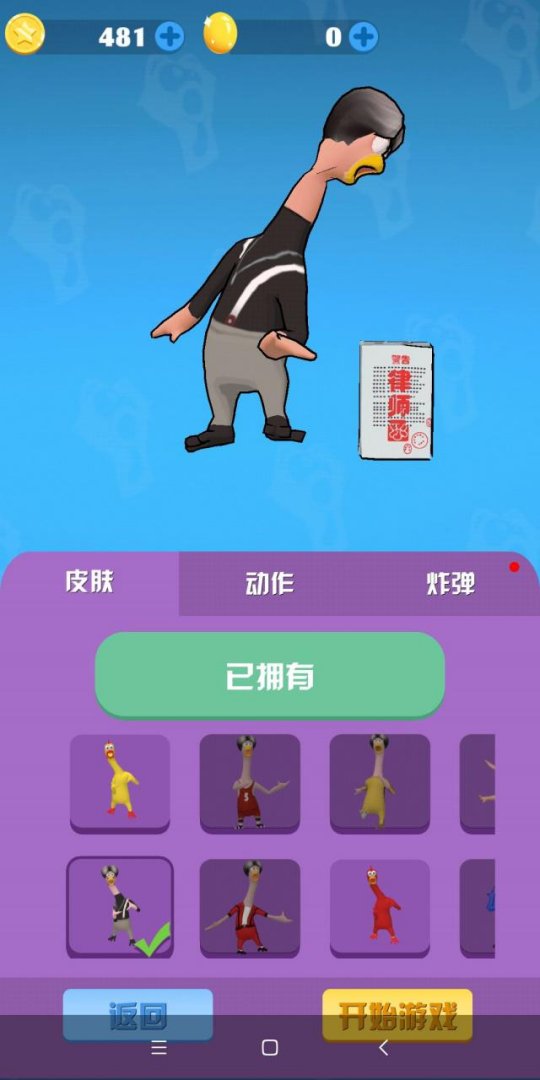 通过胜利获得的金币可以给小鸡解锁皮肤以及升级血量和炸弹威力。当然,经典的背带裤皮肤是少不了的。游戏毒性很大,随时随地都可以跟朋友来一局鸡的对决。唯一的小缺点是有些道具需要看广告来解锁。