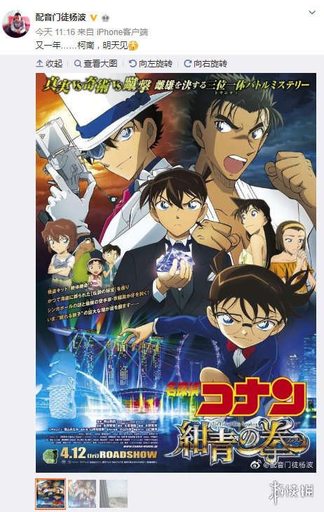 今日(6月27日),长春电影译制片厂配音演员、译制导演杨波发表微博暗示《名侦探柯南:绀青之拳》的配音工作即将开始,如果不出意外,这部柯南的最新剧场版可能已经过审,将在不久后于中国内地上映。