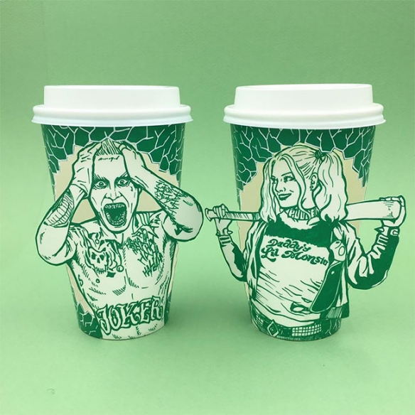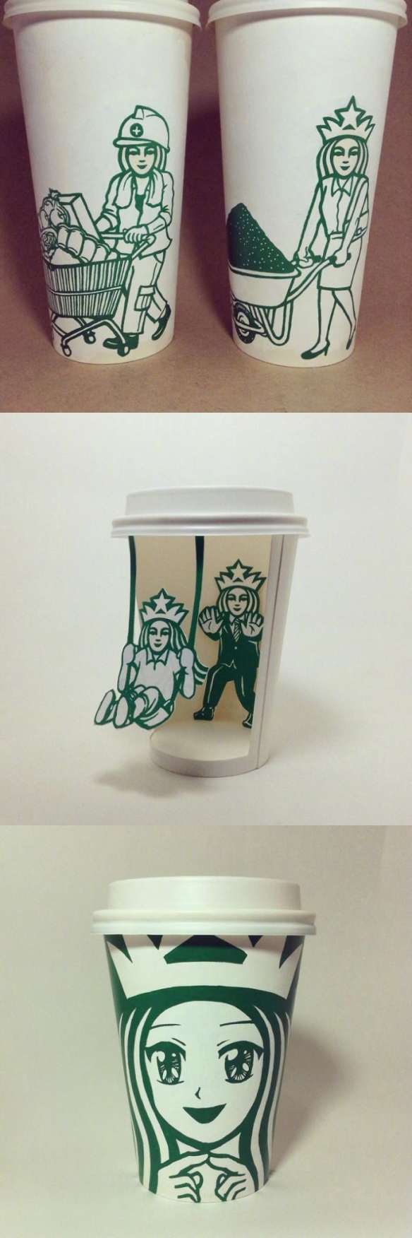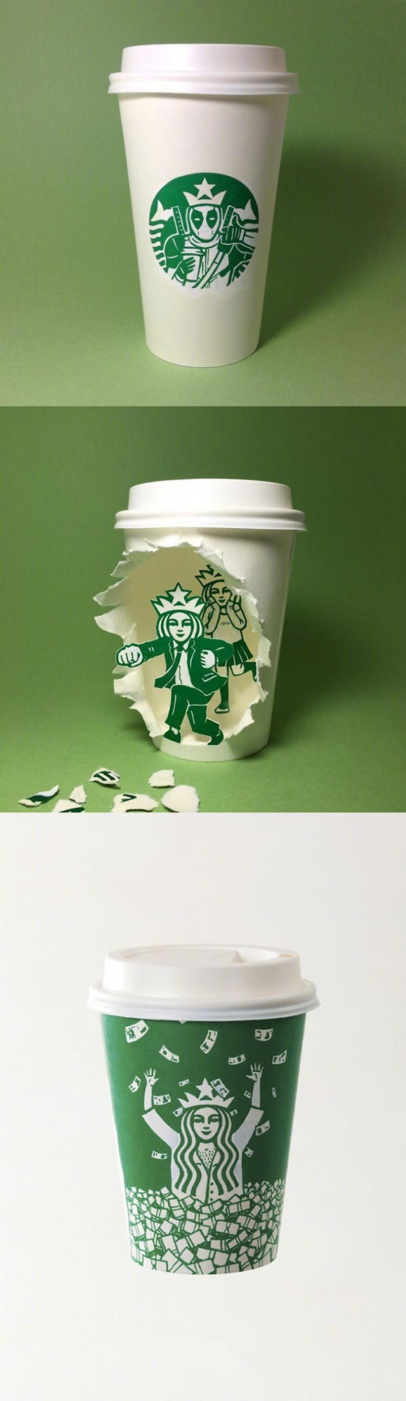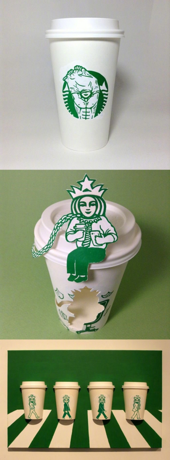 Soo Min Kim将大家总是喝完即丢的纸杯重新收集再创作,并改造了星巴克著名的美人鱼商标。他仅仅使用了一支绿色马克笔和白色颜料,再配上他精湛的画工和奇特的脑洞,为星巴克商标延伸出许多天马行空的创作,让美人鱼展现出不同于以往的有趣风貌。
