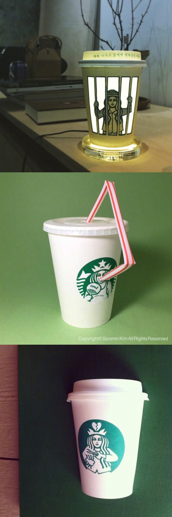 作为星巴克商标的美人鱼,在Soo Min Kim的笔下化身为现代都会下的各种女性角色:失恋K歌少女、苦闷OL、空姐或是鱼干女等,这些现代都会女性形象都成为他的创作灵感!除此之外,Soo Min Kim还大胆恶搞,将美人鱼化身为监狱囚犯、醉汉或超级英雄。其实只要多留意身旁的人、事、物,再加上一点小巧思,你会发现看似平凡的日常生活处处充满惊喜!