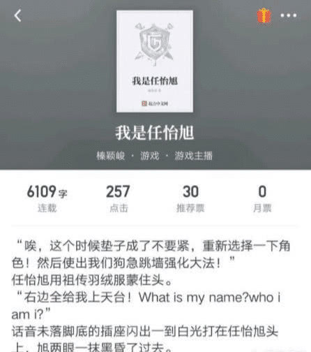 旭旭宝宝大家都知道,作为DNF的主播还是很有人格魅力的,每天总有点搞怪出彩的内容,吸引了不少想要“套他猴子”的真爱粉。这不,还真有一个粉丝给他写了个小说名字叫《我是任怡旭》。
