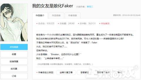 faker作为一名韩国知名《英雄联盟》职业选手,因为其出众的游戏操作能力,有不少忠实的粉丝。这不,现在就有粉丝把李哥写成了小说!