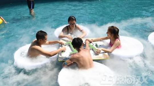 重庆一家水上乐园就想出了一个好办,那就是让游客坐在水池的冰桶里打麻将,这样即使烈日当头也清凉舒爽。