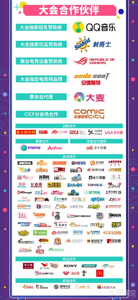 鸣谢大会独家冠名赞助商QQ音乐、大会独家指定饮品赞助商新奇士、舞台电竞设备赞助商ROG玩家国度、CICF分会场合作动漫星城以及SONY、周大福、屈臣氏、广州市青年文化宫、统一企业、老坛酸菜牛肉面、日清食品、合味道、拉王、cosama等合作方的给力支持。