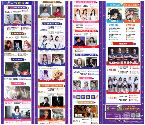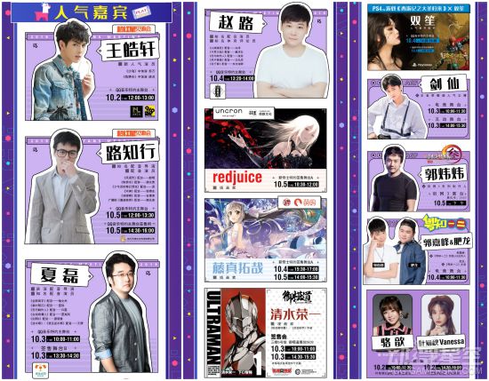 与人气歌手沈谧仁、RaJor、肥皂菌共赏QQ音乐燃歌赛,与人气歌手妖扬、佑可猫、萧雨汐接受国风音乐的熏陶,人气歌手卡修Rui也将出席展会现场。知名Lolita模特谢安然、人气女神Coser伊织萌近距离美颜暴击!国风女子组合七朵组合韦欢、吴圆圆、喻筱博与人气舞见西四(Re-m!x)、楽小漫、AcFun特邀嘉宾紫颜出席“星舞银河”宅舞大赛,V17声优少女醋醋、曦兮、筱筝出席漫次元超萌星大赛,人气舞见绯缨白、菇力帕出席漫次元宅舞赛!丝瓜卡夫卡、豆油油将作为FF14特邀嘉宾出席,与粉丝冲向第一世界!Cosplay大赛评委刘柏辰、阿海、NADA、阴川蝴蝶猪、章鱼、YUMI将出席!