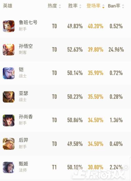 出场率方面,上周排名第一的亚瑟掉下了第四的位置,取而代之的仍然是鲁班七号。而孙悟空出场率则是碾压了铠,成为出场率第二的红人。前五中,孙尚香则是作为第五名出现,相较于上周提升了两个名次。