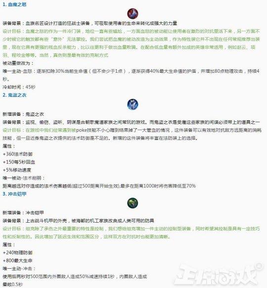 6.装备调整。血魔之怒被动重做,30%生命值扣除获得40%生命值护盾,增加80物攻;新增鬼盗之衣,增加法防、回血和移速,被动为削弱法术伤害;新增冲击铠甲,增加物防和生命,主动效果为两秒对500范围外圈敌人造成减速,内圈眩晕效果。