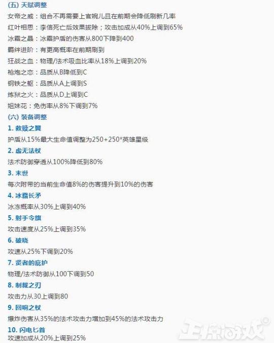 3.13名英雄调整;大量天赋调整,其中枪炮之恋品质下降;装备调整,多个装备属性加强;这里小弟不再详细叙述。
