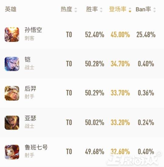 出场率方面,孙悟空已经击败了亚瑟成为新的最多出场英雄。上周排名不咋地的铠这次也是成为第二热门英雄,后羿和亚瑟只能在3/4名出现。而之前大火的鲁班七号,这次只能在第五名了。