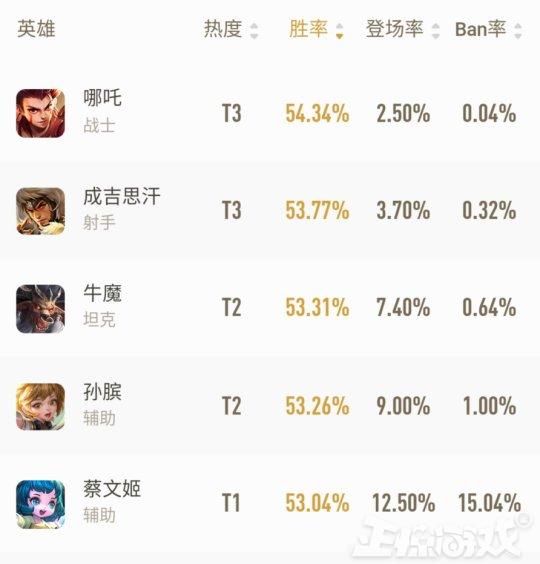 在本周的胜率榜单的前几名中,让小弟惊讶到掉下巴的是哪吒竟然登上了胜率榜首的位置,而且第二也被前段时间刚上前十的成吉思汗占领。孙膑、蔡文姬两个辅助也同时成为第四第五两个位置,可见目前英雄调整力度之大。