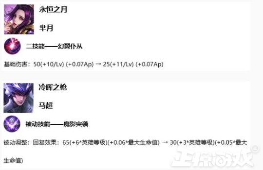 在10月16日的体验服更新中,只有芈月和马超两个英雄遭到了调整。其中芈月的二技能基础伤害值降低,等级加成增加,但总体伤害值仍处于减少状态。马超的被动恢复效果基础数值和英雄等级加成都减少一般,最大生命之系数略减少,可以说削弱较多。