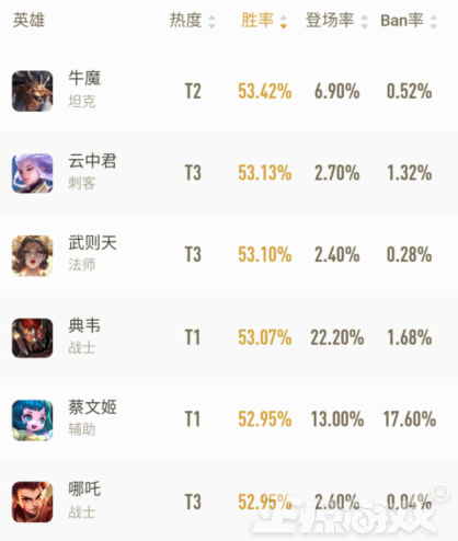 上周在被哪吒的胜率碾压之后,本周的胜率榜单有展现的新的面貌。其中牛魔就由上周的第三,一跃继续成为胜率榜首,而武则天也从第九上升为第三。而第二竟然被最近才上榜单前十的云中君占据。