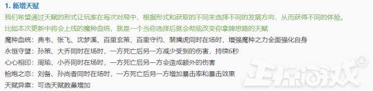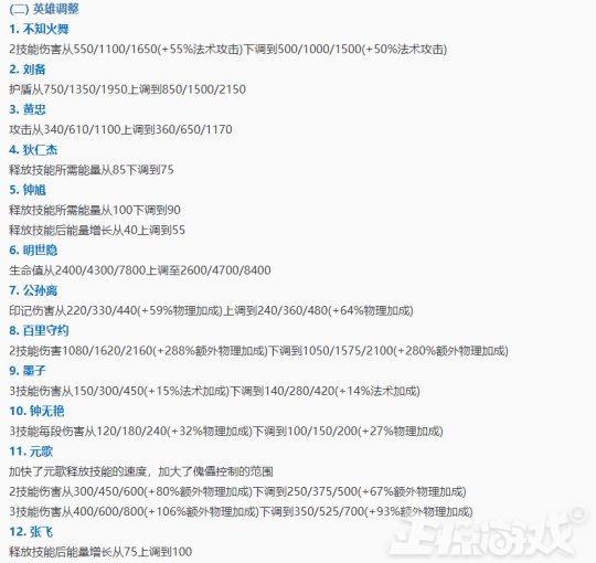 而天赋平衡中,只有雷霆剑道加强,姐妹花、不稳定收益、冰霜之晶削弱。在英雄方面,一共12名英雄调整,其中刘备、黄忠、狄仁杰、钟馗、明世隐、公孙离和张飞得到加强。