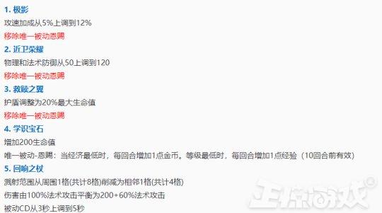 在装备调整中,官方做出一个全新的装备——学识宝石,增加生命值。如果经济最低时,每回合增加1点金币,等级最低,每回合增加1点经验。其他则是正常装备的平衡调整。