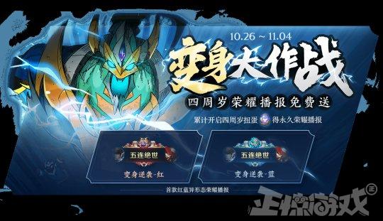 10月26日,玩家只需要登陆就可以获得四周年的专属回城特效:千灯之约,并且在变身大作战中获得变身逆袭荣耀播报,登陆9天获得击败特效:千灯之约。
