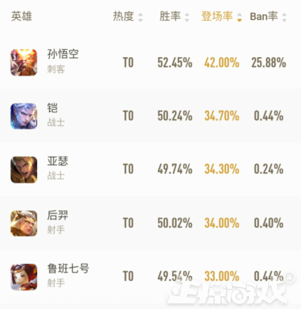 出场率榜单前五的英雄与上周几乎没有差异,唯一的差别就是后羿和亚瑟这两位玩家心中相爱相杀的英雄与上周出场榜单位置互换,本周亚瑟的出场率略微高于后羿。