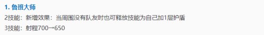 在10月26日的体验服更新中,鲁班大师再次遭到了调整。在这次的调整中,鲁班大师的二技能将新增效果:当周围没有队友时也可释放技能为自己加1层护盾。但是三技能的射程从700降低到650.