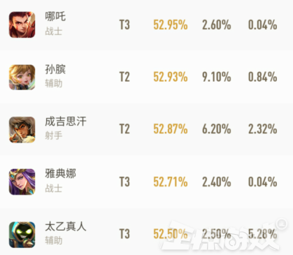 而整个前十榜单中,只有一个刺客出现,那就是云中君。而战士则是拥有数个强力英雄,由此可见上单的位置胜率还算比较高。不过上周第二的成吉思汗本周仅排在了第八,孙膑则略微高一些,在第七的位置。