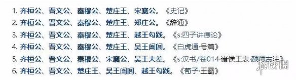 (图为几个主流说法)虽然都叫春秋五霸,但是总计有12个人上榜。各个版本间只有齐桓公、晋文公是没有争议的。现在一般课本都是用《史记》或《荀子》的版本。