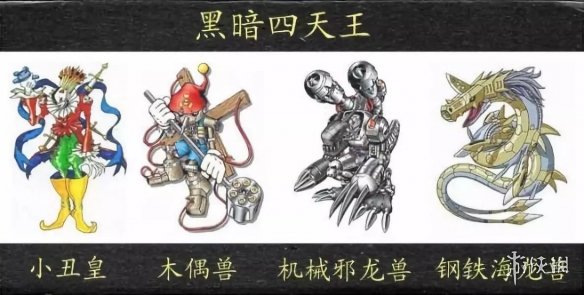 比如《数码宝贝》初代里出现的究极体反派BOSS【黑暗四天王】,分别是钢铁海龙兽、机械邪龙兽、木偶兽、小丑皇。