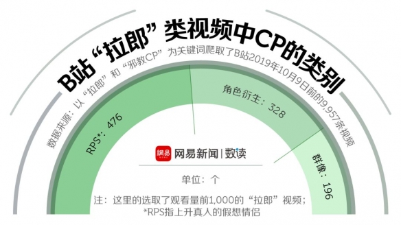 一类是上升到真人的假想情侣,在观看量前1000的拉郎类视频中占了47.6%。一类是根据文学、动画和影视作品中的角色衍生的CP,占比32.8%。