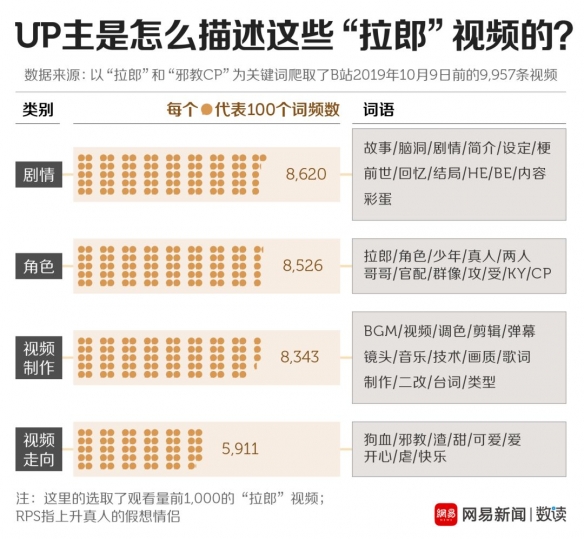 根据9957条拉郎视频的视频描述,可以发现UP主在视频描述中,剧情类词语出现最频繁,一共出现了8620次,其次是关于角色的描述,出现了8526次。剪出了剧情,拉郎就成功了一半。最可怕的不是这些八竿子打不着的人能被凑成CP,而是这些CP居然还有剧情。