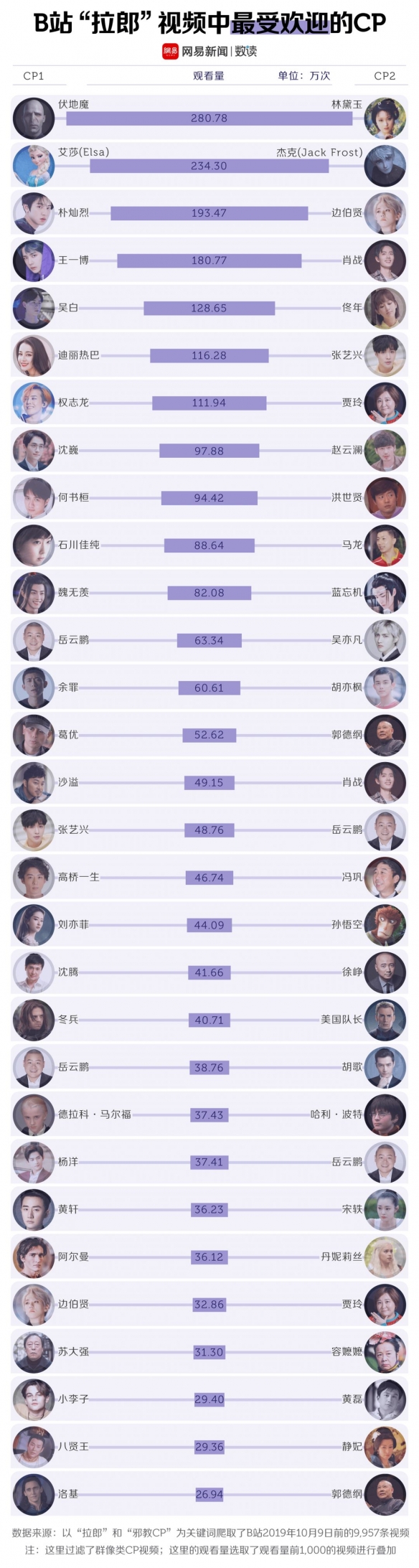 数读菌爬取了B站10月9日前的9957条拉郎视频,以观看量为标准,排出了B站最受欢迎的拉郎CP。