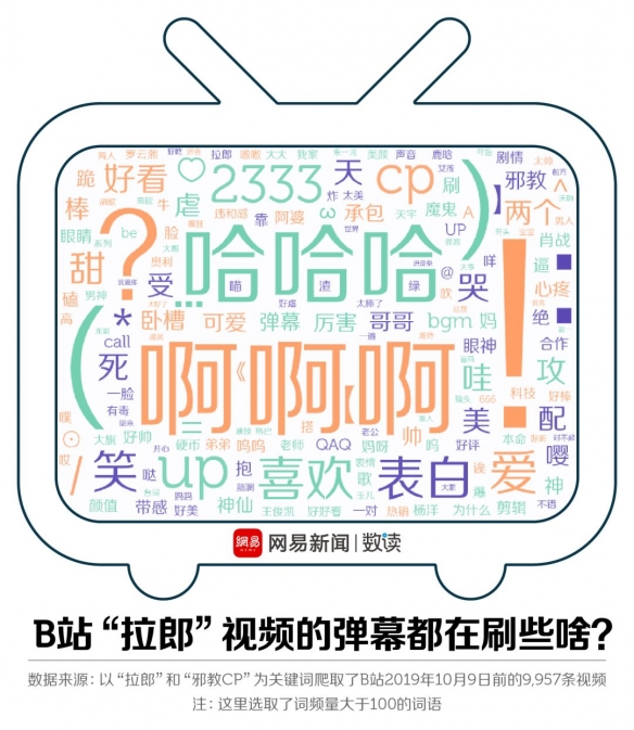 “!”“?”“~”是最常见的符号,而“啊啊啊”“哈哈哈”“2333”是最常见的语气词。“!”可以单独出现,也可以跟在句子后面来表示激动的情绪。而“?”,则更多刷屏在一些“邪教CP”视频的开头,表示疑惑和震惊。