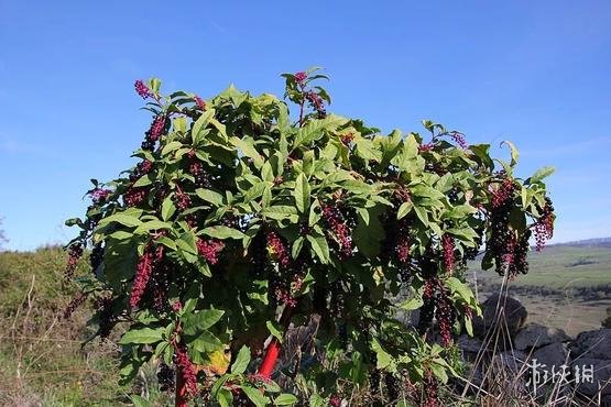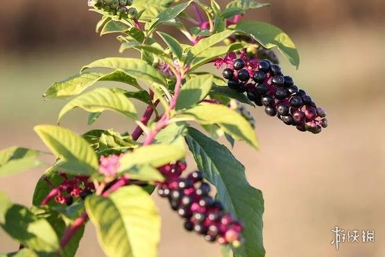 垂序商陆原产北美大部分地区,幼年时期的植株有肥大的牛舌状叶子,在初夏抽出淡紫色的总状花序,开出一串白色小花,花序往往弯曲下垂。到了果熟期,茎和果序都会变成鲜艳的紫色,果子如小葡萄一般紫黑发亮,令人眼馋。
