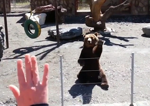 该视频由马克西姆·加夫里连科(Maxim Gavrilenko )在莫斯科附近的一家动物园拍摄。在他发现这只大棕熊耐心地坐在围栏里后,他开始给它录像。马克西姆朝棕熊挥了挥手,没想到,这只巨大的哺乳动物坐起身,也向他挥手示意,这让围观者发出一系列咯咯笑声,大家都感到十分惊喜。
