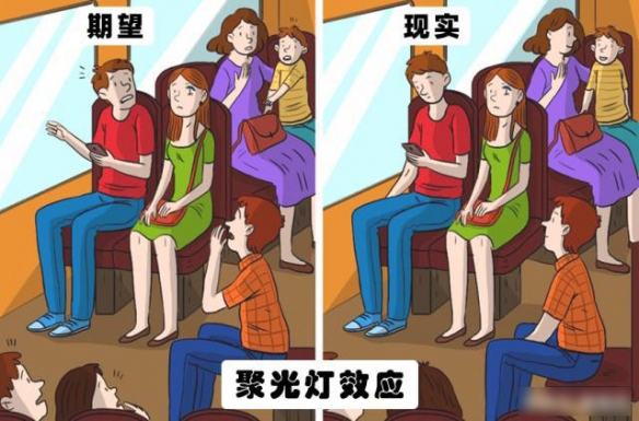 聚光灯效应往往指的是一个人过度夸大了对于自身关注的焦点,仿佛在生活中所有的目光都集中在自己的身上,从而将自身所有的错误或缺陷放大。比如某一天,一个人没有画好眼妆便出了门,而她一路上都感到不适,感觉路上的行人们都在不断的盯着自己看,觉得自己比以往要丑陋得多。但事实上,你得明白,大多数的人都很忙,而且一路上的风景.行人很多,没有人会非常无聊的盯着一个陌生人不停的看,甚至注意这个陌生人身上的一切。来自美国康奈尔大学的心理学研究工作者们就曾经进行过一项实验,他们让一些人穿上了印有错误印花图案的T恤外出,并且计算到底有多少行人注意到了错误。然而没有注意到的人比注意到的人数至少多出两倍。