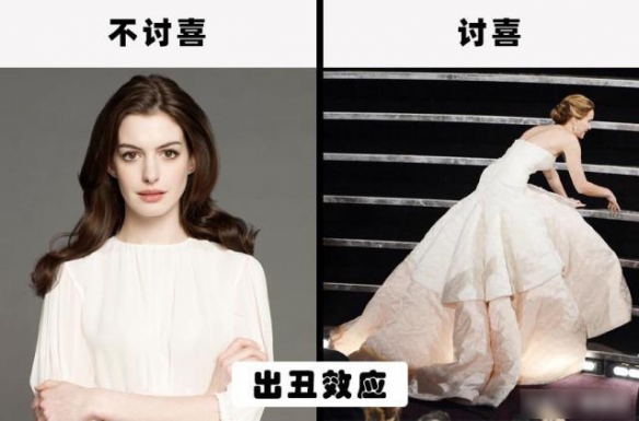 顾名思义,出丑效应指的就是那些偶尔犯点错误,出些丑的人其实要比那些完美无瑕的人更有吸引力。其实很容易理解,一个女孩无论是从外貌.性格.行为等各方面来看都是异常的完美,完美得让你觉得是你触不可及的对象,那对你来说的确太过于遥远。你更多的只会是站在远处欣赏。而反观那些在各方面同样看起来优秀,可却总是犯下一些普通人也会犯下的错误的女性。她们则会让你感觉更加的亲切和贴近你的生活,你会打从心底接受和喜欢上她。
