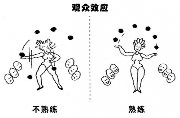 通俗而言,观众效应指的其实就是,当我们在做某些事情的时候,现场是否存在观众,会影响到我们行为的质量。如果一个人所做的事情并不熟练,那么观众的存在,让其更容易束手束脚,出现紧张和失误的状况,会比没有观众的时候表现更糟糕;反过来,如果一个人所做的事情已经相当熟练了,观众的存在反而会激发此人内在的表现欲望,他会更加专注,最终的表现可能会比独自操作的时候更加良好。