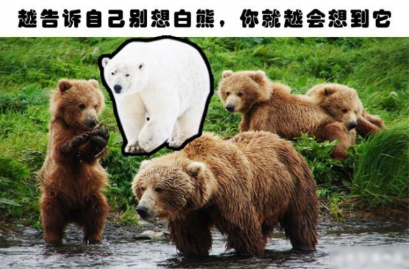 当一个女生失恋了,为了避免让自己伤心,她在内心告诉自己,不要想念和回忆前任。然而,现实是,她的这种想法带来了反效果,她变得越来越想前任。而这个过程就是所谓的“白熊效应”,白熊效应指的是,不让你思考白熊,只思考黑熊,你反而会更常思考白熊。反过来,如果不进行提示要求不思考白熊,思考白熊的几率反而更低。我们在生活中,常常会受到“白熊效应”的影响。