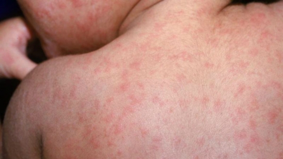 症状:高烧、从头到脚的皮疹、各种并发症,例如脑肿大、致盲、严重的呼吸道感染。