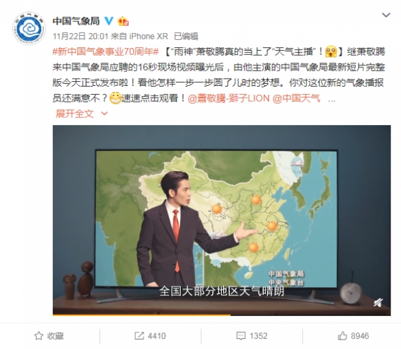 11月22日,为了庆祝新中国气象事业70周年,中国气象局邀请“雨神”萧敬腾当“天气主播”。继上次应聘的16秒现场视频曝光后,中国气象局发布了一段由萧敬腾主演的气象短片。