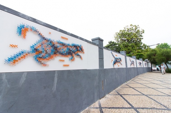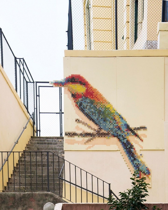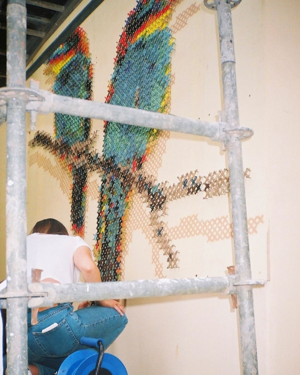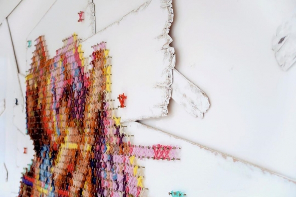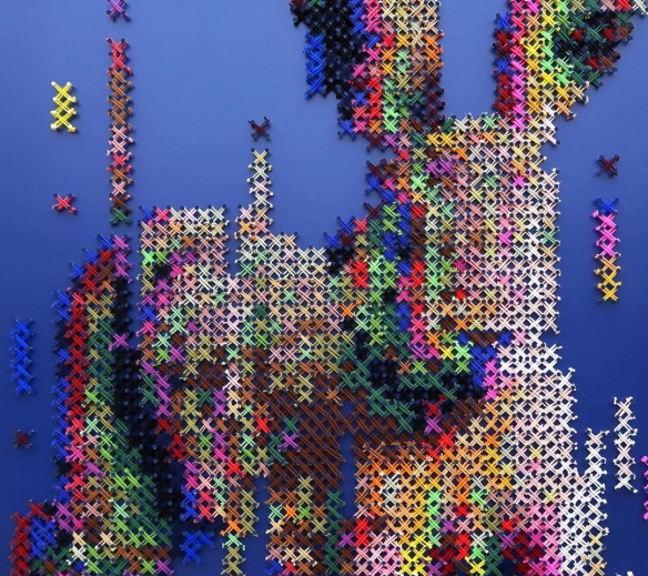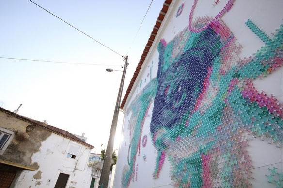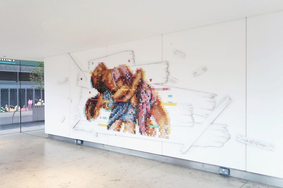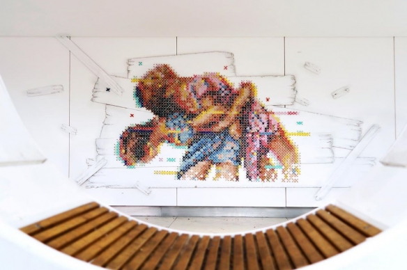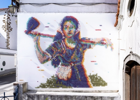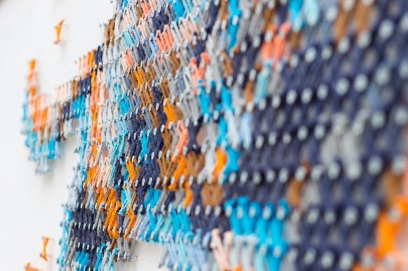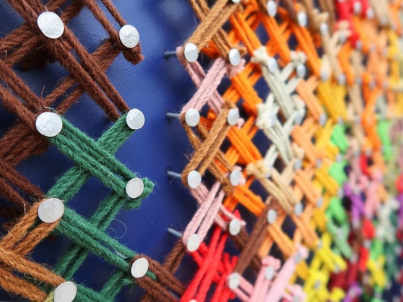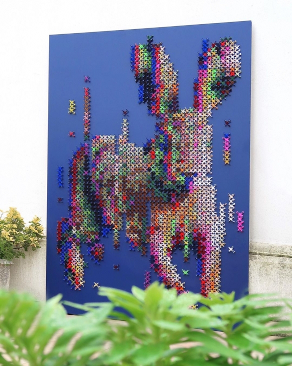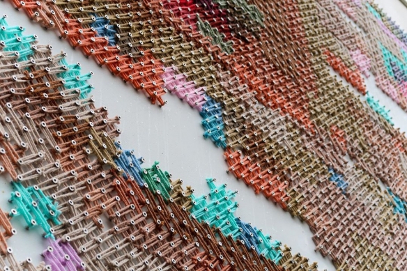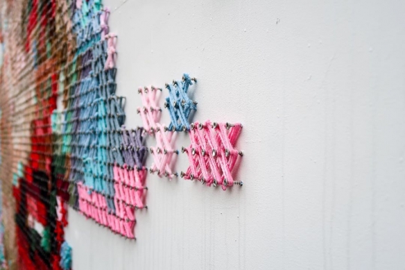 Aheneah是一位专注于刺绣和图形的葡萄牙艺术家。获得了平面设计学位后,她发现了设计世界和纺织世界,她决定将其与祖母灌输的刺绣教学联系起来。她使用钉在墙上的钉子以及钉子之间缠绕的彩色毛线,构成了一幅幅画作,远看效果宛如十字绣一般。