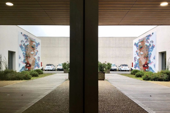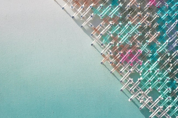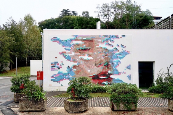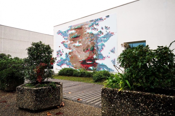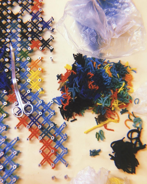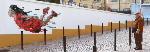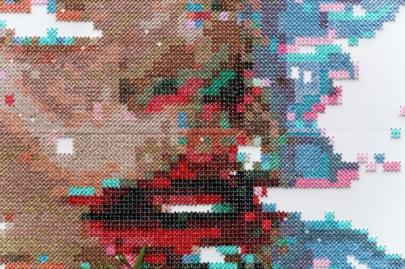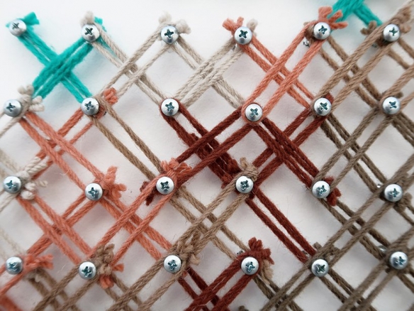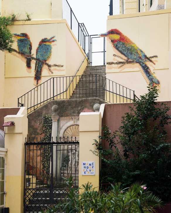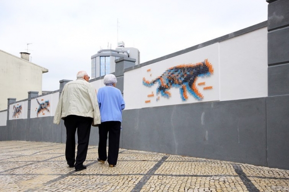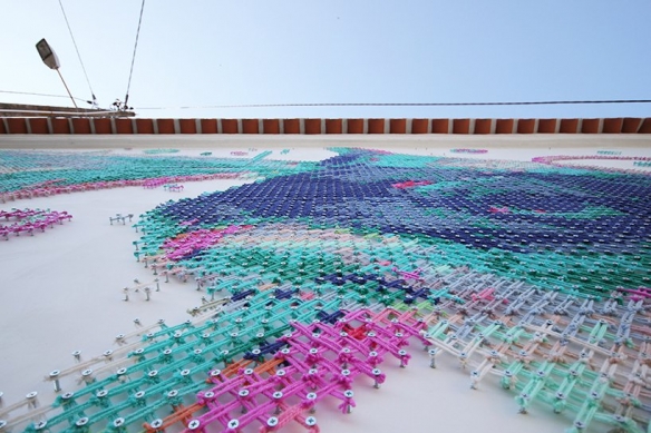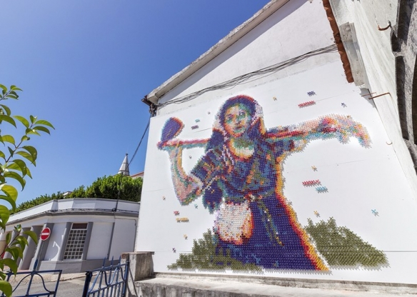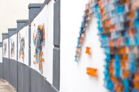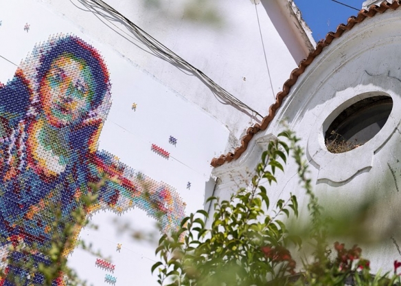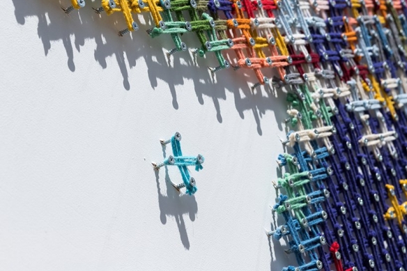 Aheneah是一位专注于刺绣和图形的葡萄牙艺术家。获得了平面设计学位后,她发现了设计世界和纺织世界,她决定将其与祖母灌输的刺绣教学联系起来。她使用钉在墙上的钉子以及钉子之间缠绕的彩色毛线,构成了一幅幅画作,远看效果宛如十字绣一般。
