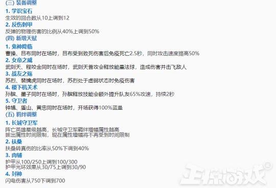 在装备上学识宝石和反伤刺甲都进行了加强。而在天赋中,新增了5个的强力的天赋。羁绊调整中,长城守卫军和肉辅的属性数值都进行了加强,而扶桑和封神两个天赋的数值却遭到了削弱。