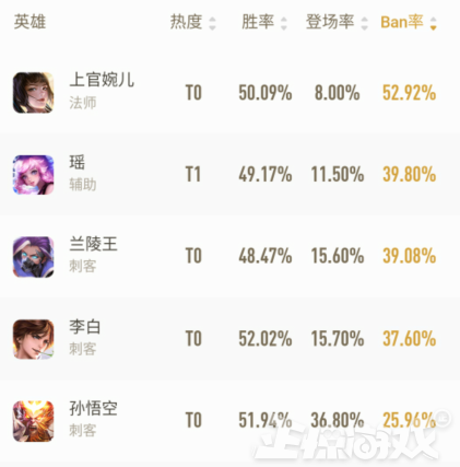 Ban率榜单中,已经可以秀翻天的上官婉儿仍然处于玩家最多选择的第一名。而辅助无敌的瑶延续第二,秀操作高伤害的兰陵王、李白和孙悟空三大刺客这次也是顺序成为榜单三到五名。
