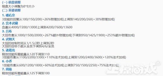 王者模拟战这次依旧有比较大的更新,首先就是棋盘的大小被改为8X8的大小了。英雄调整中橘右京、宫本武藏、诸葛亮、周瑜和小乔得到了加强,吕布和武则天被削弱。