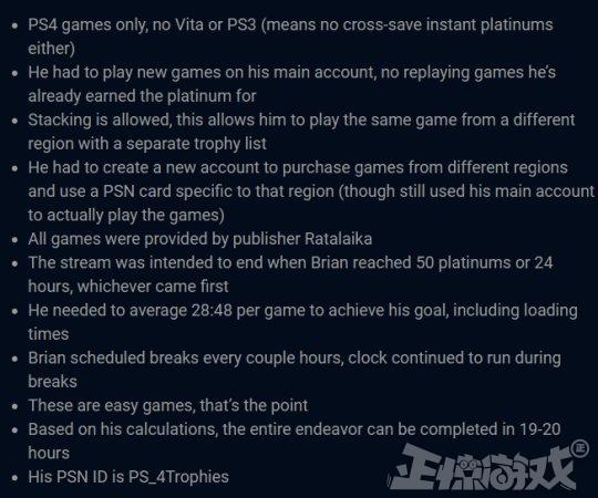 而且为了达到这个目标,Brian可以说是指定了非常详细而且合理的计划。其中就包括只限定PS4游戏,允许在相同的奖杯在不同地区使用不同的奖杯列表,游戏时间包括载入时间在内,但每隔几小时会有不记录在内的短暂休息时间等等。而且为了防止意外,游戏清单中还预留了7个备选游戏。