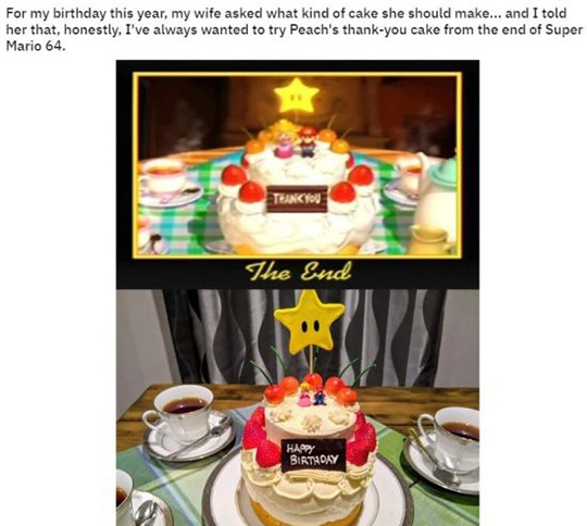 网友u/alandenton在Reddit上就发布了一条帖子:“感谢我的妻子!为了我的生日准备了这么棒的礼物,这是我一直想要的桃子公主的感谢蛋糕。”