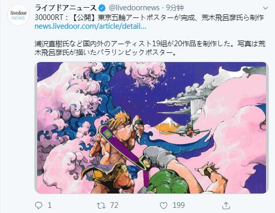 本届东京2020奥运会的各种海报艺图将由著名漫画家浦沢直树领导的艺术家团队主导设计;而东京2020残奥会的各种海报艺图将由著名漫画家荒木飞吕彦领导的艺术家团队主导设计,总计将有19组知名艺术家参与创作。