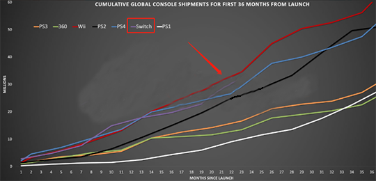 另外在销量上,Switch仅用了9个月时间,就达到了1486万台,超过了前代Will U 五年售出1356万台的记录,而就在今年的10月,任天堂又取得了“北美1500万台”与“欧洲1000万台”的销售记录。