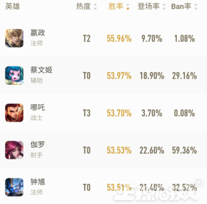 在本周的胜率榜单中,与上周一样的莫过于嬴政在本赛季的强力统治,仍高居榜首。伽罗从上周第二跌落至第四,二三名分别被蔡文姬和哪吒代替,其中哪吒似乎又展现了之前的潜力。第五则是控制类英雄钟馗,与上周相同。