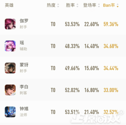 而出场率和热度榜单与上周变化不大,小弟这里便不再过多介绍。而Ban率榜单与上周差异较大,其中就包括伽罗再次成为榜首,瑶居第二。蒙犽本周超过李白成为第三,后者在第四名。而之前数周都在前五的兰陵王本周统治力不再,钟馗成功上位第五名。