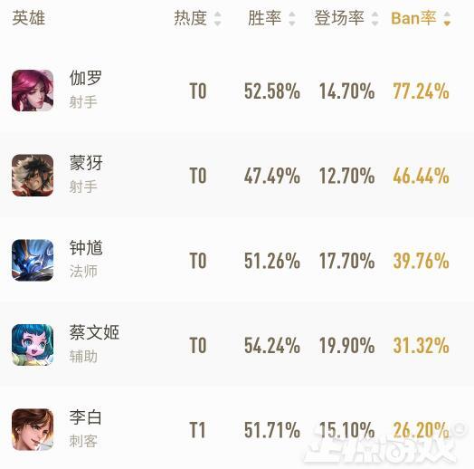 虽然出场率和热度榜单与上周比较差距仍然不大,但是Ban率榜单中的诸位却出现了一些小小的变化。首先伽罗、蒙犽、钟馗三人仍占据前三,但第四从上周的瑶已经变成本周的蔡文姬,李白还是在第五名,瑶却变成了第六。