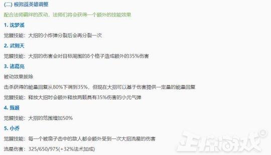 王者模拟战中蜀国和法师羁绊调整,13名英雄进行了调整,其中诸葛亮等被削弱,弈星和不知火舞等加强。7件装备调整,包括回响之杖、辉月等基本都是削弱。起舞天赋进行削弱。