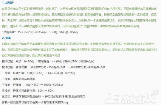 伽罗的三技能减速效果削弱的,但新增了法阵关闭给圈内英雄沉默效果。甄姬被动冷冻时间增强,但二技能弹射半径略有减弱。武则天的一技能伤害进行了加强。刘备的被动双抗变成物理穿透,总体技能伤害都进行加强,护盾量、转化率都增加,三技能免控改为开技能后3秒。